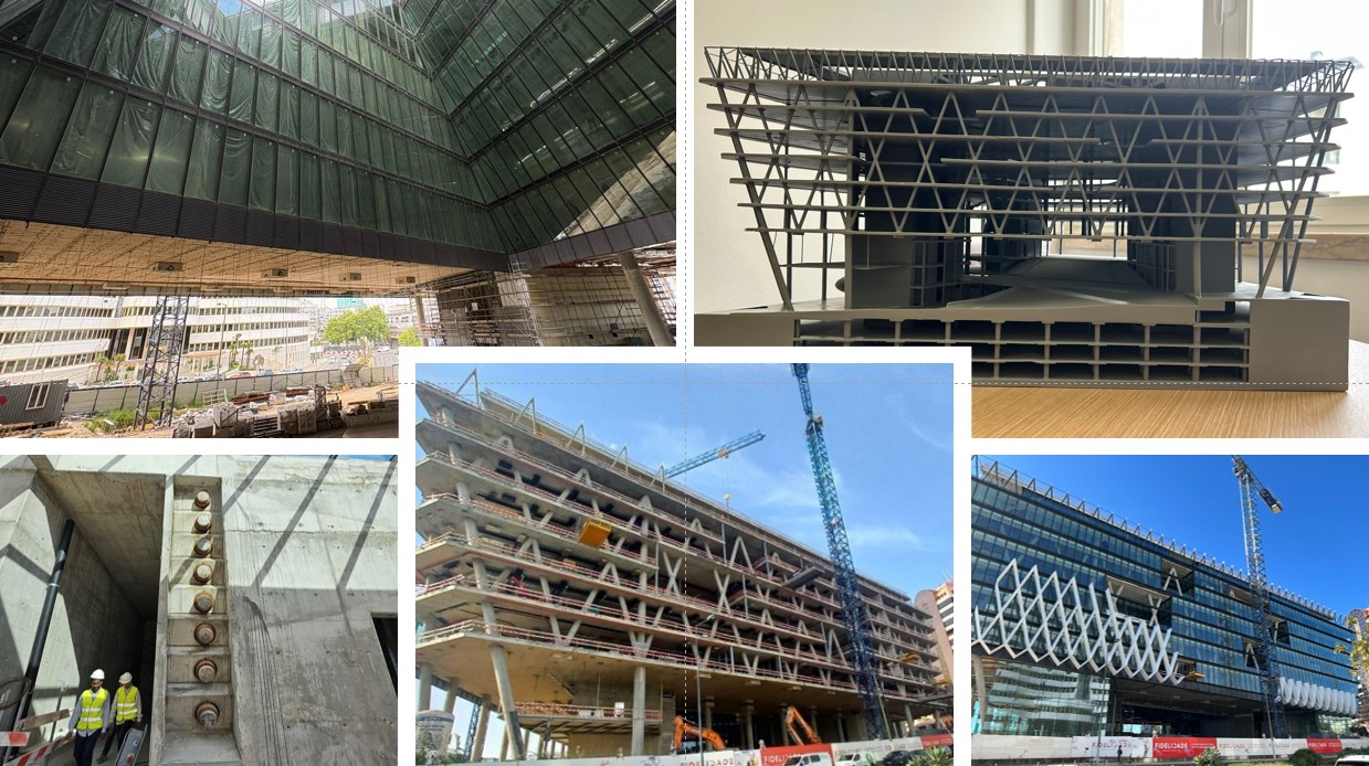 The Fidelidade Headquarters – Phoenix Building, under construction since March 2023 and set for completion in June 2026, incorporates a distinctive structural solution developed to maintain uninterrupted public circulation across the site. This requirement led to column‑free spans of up to 60 m at ground level, made possible by major rooftop load‑transfer structures.